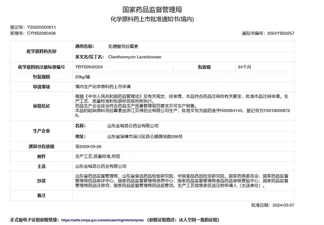近日,金城醫(yī)藥集團(tuán)全資子公司山東金城昆侖藥業(yè)有限公司收到國(guó)家藥品監(jiān)督管理局下發(fā)的乳糖酸克拉霉素《化學(xué)原料藥上市批準(zhǔn)通知書(shū)》。 國(guó)家藥品監(jiān)督管理局網(wǎng)站顯示,乳糖酸克拉霉素的相關(guān)劑型為片劑和…